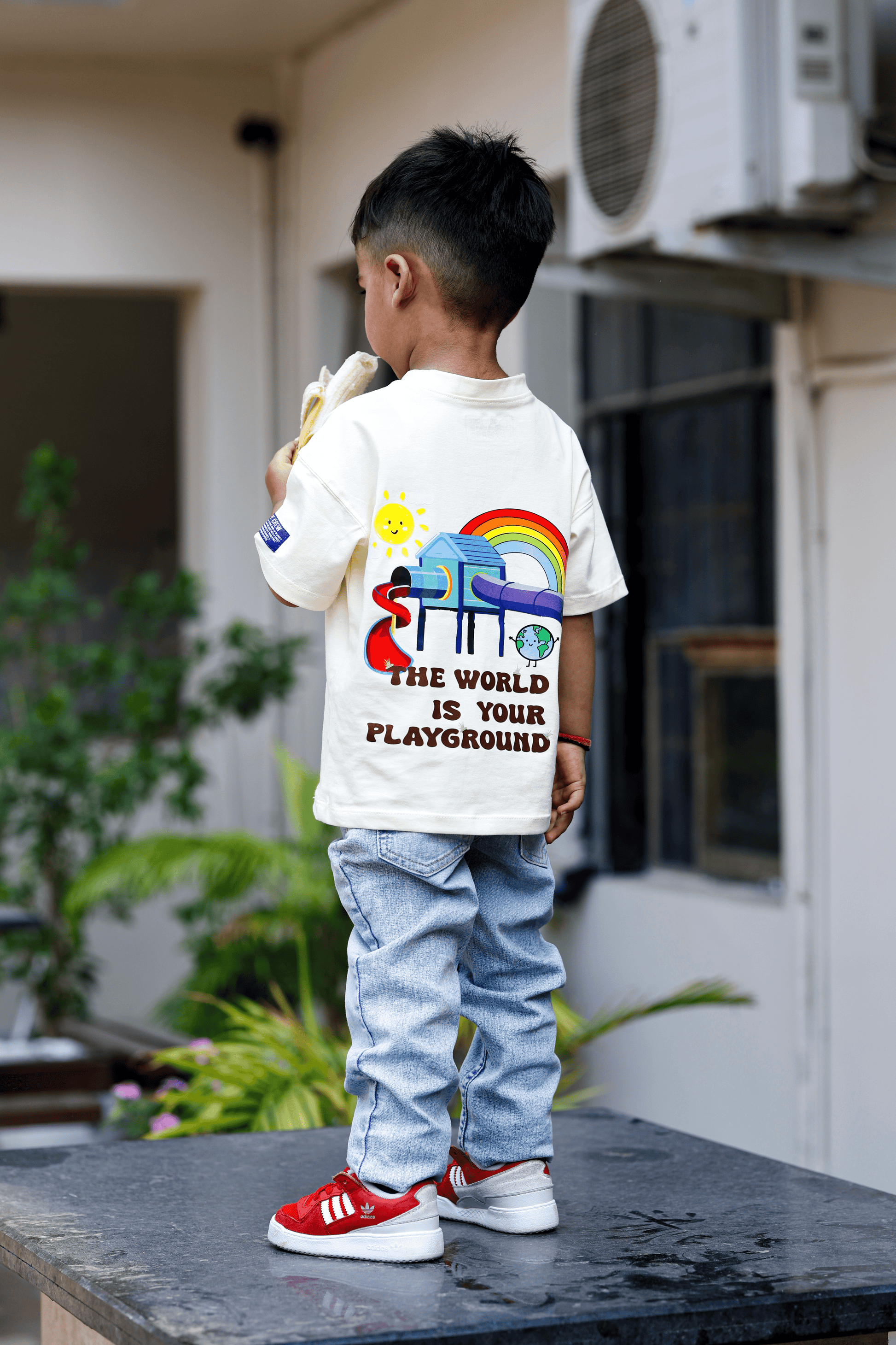 Let their imagination run wild in this oversized tee crafted from premium buttery-soft cotton. Featuring a playful back graphic with a rainbow slide and the message “The World Is Your Playground”, this tee is perfect for curious little explorers. Finished with minimal branding on the front for that clean, everyday look.