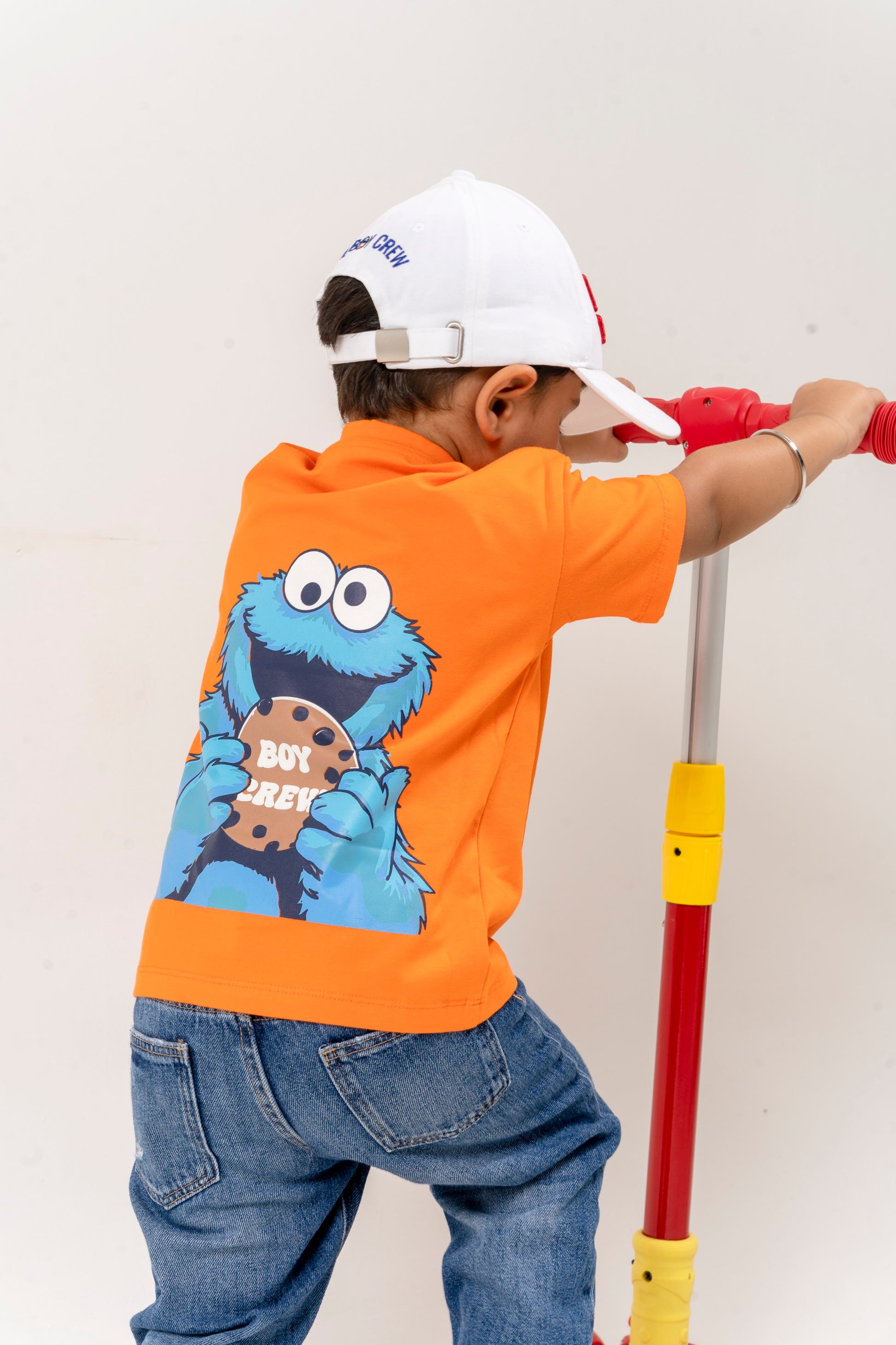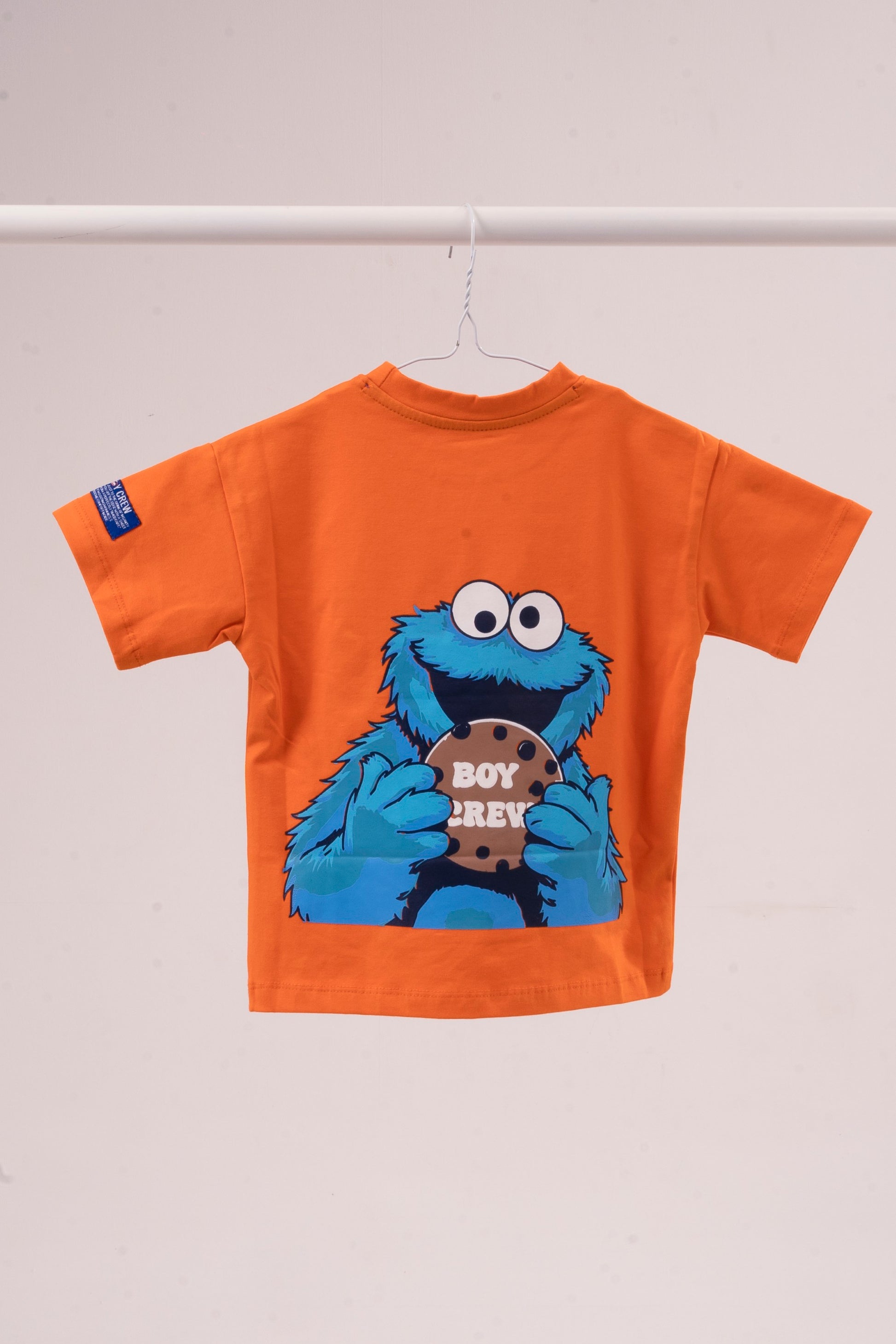This oversized tee in a bold orange hue is crafted from premium buttery cotton for all-day comfort. Featuring subtle branding on the front and a bold Cookie Monster graphic on the back, it’s designed for the little ones who bring big energy.