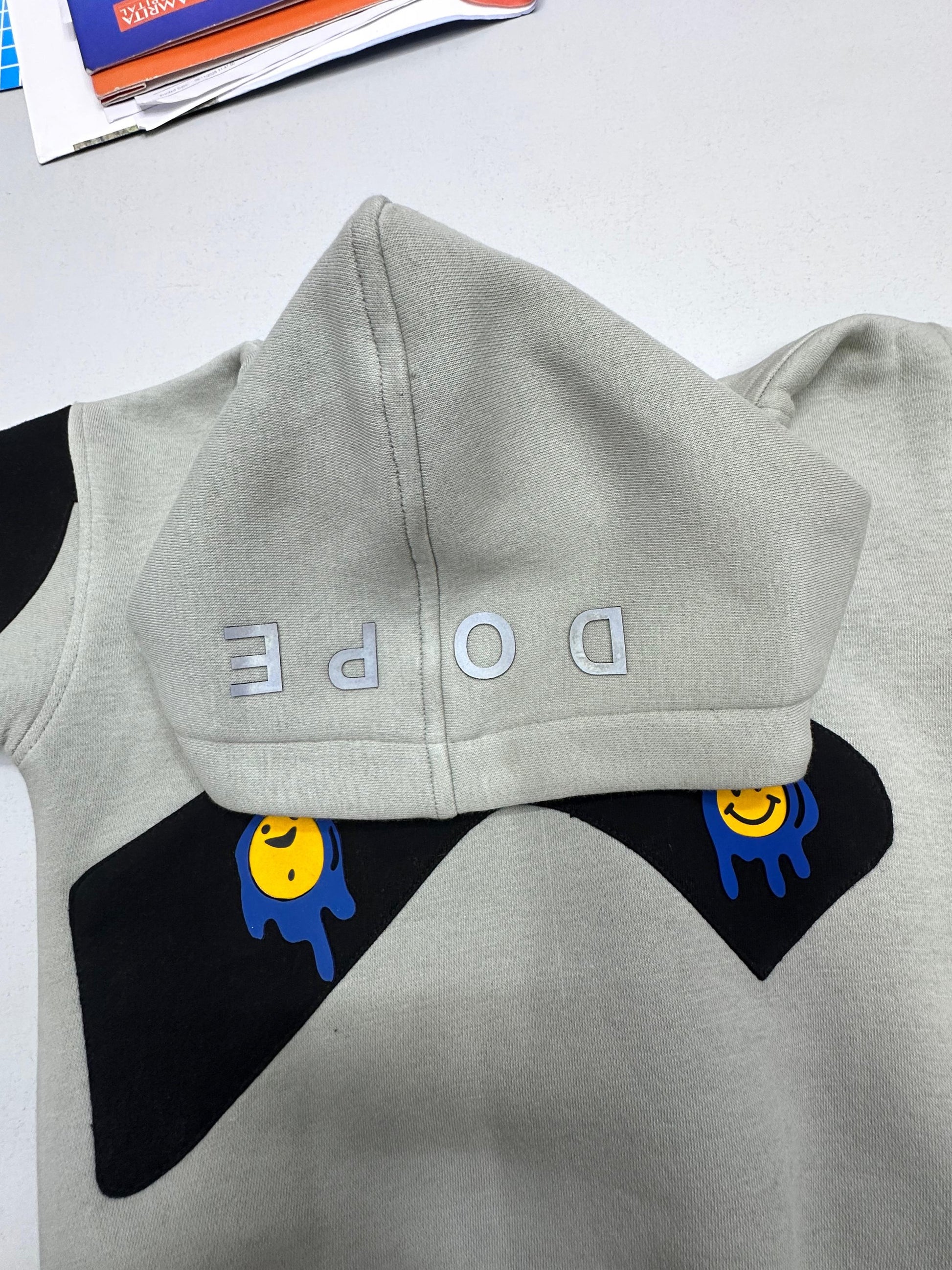 This premium heavyweight fleece-lined hoodie features a bold reflective “DOPE” on the hood, three gel smiley patches, and striking black cut-and-sew panels across the chest and sleeves for that signature streetwear edge.